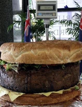 據(jù)報道,這個漢堡包總共重將近100公斤,打破了由美國密歇根州84公斤漢堡包創(chuàng)下的紀錄。