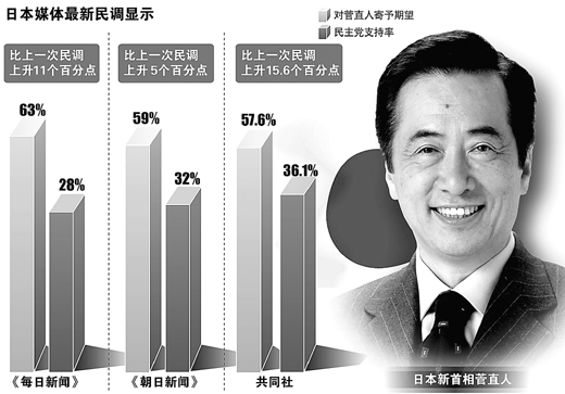 如果說去年9月民主黨實現(xiàn)政權更迭是日本政治的歷史性轉折,那么今年6月民主黨再次組閣則是擺脫該黨頹勢的重要轉折。近日,日本多個民調(diào)顯示,民主黨的支持率正迅速大幅回升。