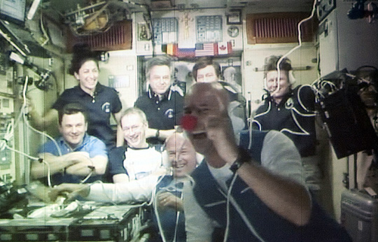 此次在國際空間站逗留、觀光期間,拉利伯特干起雜技演員老本行,戴上小丑鼻子道具,在零重力狀態(tài)下與自己的孩子們進行視頻通話。此外,他還完成了一項特殊使命──在國際空間站與地面舉行了“地空聯(lián)機”,呼吁公眾關注水資源問題。