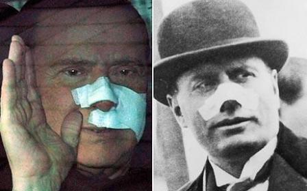 中新網(wǎng)12月21日電 綜合媒體21日報(bào)道,近日意大利總理貝盧斯科尼遇襲險(xiǎn)遭“毀容”,他出院時(shí)鼻子包裹紗布的形象,讓人聯(lián)想到二戰(zhàn)時(shí)意大利的法西斯獨(dú)裁者墨索里尼。