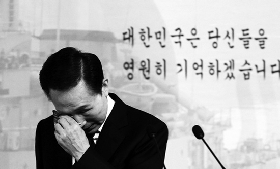 “身為總統(tǒng),我要將天安艦沉沒原因一查到底,徹底查明真相……”說到這里,身著黑色西裝的李明博聲音開始哽咽,隨后他從右邊褲兜中掏出藍色的手絹擦了擦鼻子,然后繼續(xù)語氣堅定地說:“調(diào)查結(jié)果出來后,我們要堅定不移地采取果斷措施!