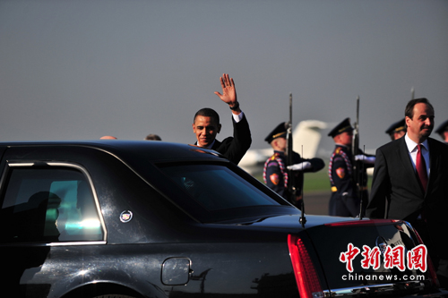 奧巴馬總統(tǒng)于當(dāng)?shù)貢r(shí)間8日上午9時(shí)30分(北京時(shí)間8日15時(shí)30分)步下降落在布拉格魯濟(jì)涅老機(jī)場(chǎng)的“空軍一號(hào)”專機(jī)舷梯。簽字儀式在兩個(gè)半小時(shí)后舉行。