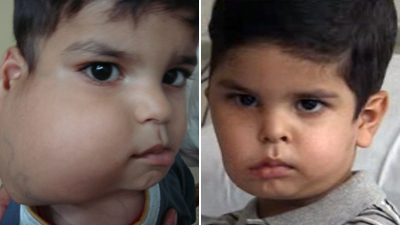 中新網(wǎng)8月6日電 據(jù)英國(guó)天空新聞臺(tái)報(bào)道,來自伊拉克的3歲男孩賽義夫•巴賽木剛剛在倫敦的圣喬治醫(yī)院接受了三項(xiàng)手術(shù),其中最長(zhǎng)的一項(xiàng)長(zhǎng)達(dá)九個(gè)小時(shí)。手術(shù)后,他擺脫了臉上一個(gè)巨大腫瘤的困擾。