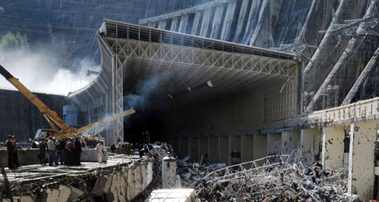 俄羅斯最大水電站薩彥-舒申斯克水電站位于俄西伯利亞地區(qū)哈卡斯共和國(guó)境內(nèi),17日清晨,在工作人員執(zhí)行維修工作時(shí),一個(gè)變壓器爆炸,毀壞了引擎室里的墻壁和天花板,并導(dǎo)致室內(nèi)水管壓力激增而爆裂,引擎室被水淹沒(méi),造成水災(zāi)。據(jù)悉,水電站大壩本身沒(méi)有受損,也沒(méi)有對(duì)當(dāng)?shù)鼐用顸c(diǎn)造成威脅。