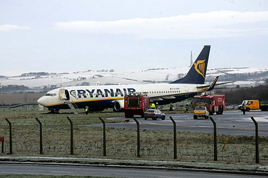 一架從都柏林起飛的波音七三七客機(jī),在蘇格蘭西部的貝勒斯特威怡機(jī)場降落時(shí),因?yàn)槁访娼Y(jié)冰而滑出跑道,飛機(jī)最后停在跑道西側(cè)的草坪邊緣。