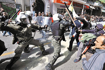 其中在雅典中部有三萬多人示威,于國會(huì)大樓外等多處地方,示威者向防暴警察投擲石塊和汽油彈,放火燒車和垃圾桶,又破壞銀行、珠寶店、戲院等10多間商店,警方發(fā)射催淚彈和手榴彈驅(qū)散人群。