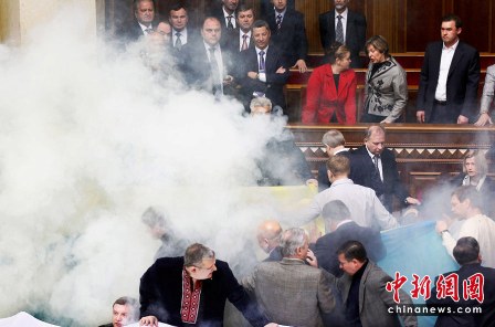 27日,烏克蘭最高拉達召開會議,討論是否通過俄黑海艦隊駐烏克蘭克里米亞半島的租期延期協(xié)議,但會議現(xiàn)場一度發(fā)生騷亂。議長利特溫被反對派議員用雞蛋打,不得不撐開黑傘躲在后面,F(xiàn)場還發(fā)生了肢體沖突,人們扭打在一起,一片混亂。更有人趁亂在議會廳內(nèi)放置至少二顆煙霧彈,導致大廳被一片濃煙籠罩,大家紛紛捂住口鼻。