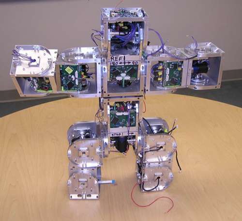 南加州大學(xué)多形態(tài)機(jī)器人學(xué)實(shí)驗(yàn)室兩年多前開始研發(fā)這款“超級(jí)機(jī)械人”(Superbot)。它是由一百塊模塊組成,目前僅完成了頭二十塊。它雖然不能真的像《變形金剛》電影中的機(jī)械人那樣變成貨車或“F-22”戰(zhàn)斗機(jī),但它的變身能力仍令人咋舌:它可以“長(zhǎng)出”一對(duì)、兩對(duì)或三對(duì)“腿子”,可以像蛇那樣滑行,也可以像毛蟲那樣蠕動(dòng)。其中六塊模塊可以形成履帶,有些組合還可以舞動(dòng)繩子。研究主管沈偉明(音譯)稱:“它要攀爬時(shí)可以長(zhǎng)出腿子,要下山時(shí)則可以變成球狀或者索性滾下去!迸c賓夕法尼亞大學(xué)去年展出的模塊機(jī)械人相似,它解體后能夠自我修復(fù)和自我重裝:每個(gè)模塊儼如一個(gè)獨(dú)立的機(jī)械人,而且可以利用紅外線和無(wú)線電訊息互相“對(duì)話”;它們又會(huì)一直評(píng)估周遭情況,包括附近有沒(méi)有其它模塊,以及它們本身是否需要變成手腳。