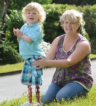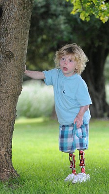 中新網(wǎng)7月29日電 英國(guó)一名3歲男童前年患上腦膜炎,要切除雙腿,最近他裝上1.25萬(wàn)英鎊的仿生義肢,并重新學(xué)會(huì)走路。