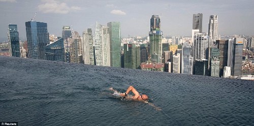 報(bào)道稱,建在樓頂?shù)挠境乜雌饋砣缤嫜由斓降仄骄一般壯觀。你可以一邊游泳,一邊俯瞰新加坡靚麗的城市風(fēng)光。從泳池溢出的水會(huì)滲入到特別設(shè)計(jì)的集水區(qū),并通過水泵和水處理系統(tǒng)重新回到泳池中。