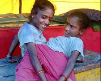中新網(wǎng)8月4日電 印度知名連體嬰甘加和賈姆娜姐妹,兩人從腰部相連,共有兩個(gè)心臟、兩個(gè)腎臟、四只手、三條腿、一個(gè)肝臟和一副生殖器,因?yàn)楸仨氂盟氖秩_爬行,所以被稱為“蜘蛛女”,她們共同的丈夫接受媒體采訪時(shí)表示自己不會(huì)偏心,兩個(gè)一樣愛。