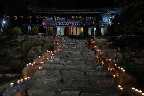 在盧武鉉的最后行程——從私宅通往貓頭鷹巖的路口大蒜地附近,有用燭光拼成的“盧總統(tǒng)愛(ài)您”的字句照亮黑暗。