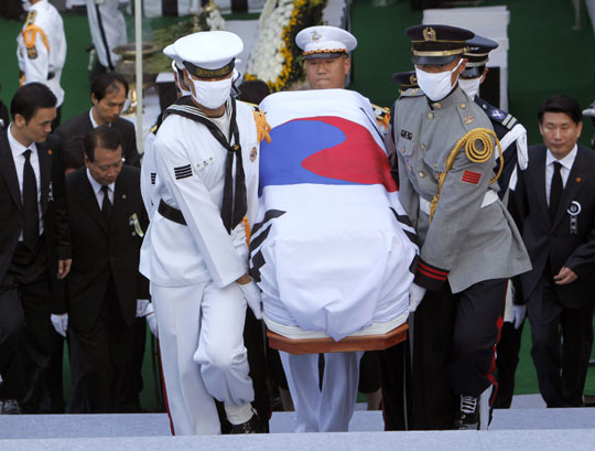 金大中遺屬李姬鎬女士等、韓國(guó)總統(tǒng)李明博和第一夫人金潤(rùn)玉、前總統(tǒng)金泳三、憲法機(jī)關(guān)負(fù)責(zé)人、駐韓外交使節(jié)、各國(guó)代表及市民等歷史最大規(guī)模的3萬(wàn)多人參加了當(dāng)天在國(guó)會(huì)前院舉行的遺體告別儀式。儀式持續(xù)約90分鐘。