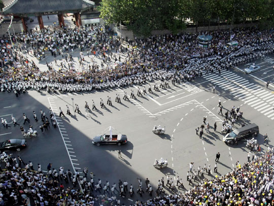 據(jù)報(bào)道,從遺體告別儀式舉行地到東橋洞私宅、首爾市廳前以及銅雀洞國(guó)立墓地的路上,云集數(shù)十萬(wàn)人,送金大中最后一程。