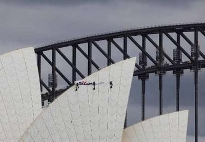 據(jù)報道,在哥本哈根召開的氣候峰會上,發(fā)達國家和發(fā)展中國家兩大陣營之間仍在僵持,各界對峰會結(jié)果的悲觀情緒彌漫會場。15日,5名綠色和平組織成員抓著繩索爬上了悉尼歌劇院,并拉開一個100平米大的條幅,上面寫著“不要再玩政治——立刻達成氣候協(xié)議”。事后,這5人被警方逮捕。