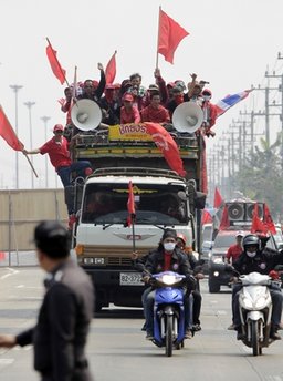 據(jù)報(bào)道,尤其是在曼谷皇家田廣場一帶,到處都可見紅衫軍的車隊(duì)和旗幟。12日,“反獨(dú)裁民主聯(lián)合陣線”先進(jìn)行熱身,在市內(nèi)6處地點(diǎn)進(jìn)行集會(huì),作為14日大集會(huì)的前奏。