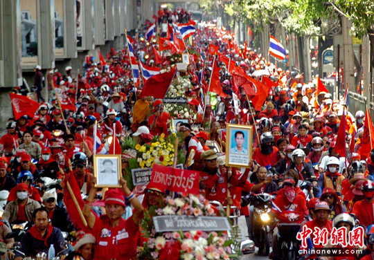 12日早上,紅衫軍在曼谷市區(qū)抬著11個(gè)棺材舉行游行,稱里面放著死于10日暴力沖突的喪生者遺體,借此向政府施壓,要求阿披實(shí)下臺(tái)。