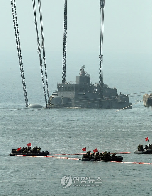 中新網(wǎng)4月23日電 據(jù)韓聯(lián)社報道,韓國軍方和打撈公司從當?shù)貢r間23日上午8點49分起,開始把“天安”艦船頭扶正。未過多時,往右邊傾斜的船頭漸漸浮出水面,露出寫著“天安”艦識別編號“772”的部位和艦橋。
