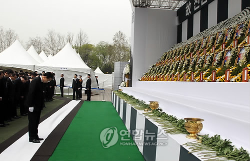 李明博向犧牲官兵獻(xiàn)花燒香后,以悲痛的表情默哀,之后面對一個(gè)個(gè)犧牲官兵的遺照審視了良久。