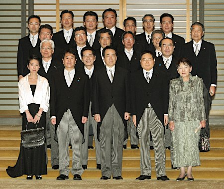 前任鳩山內(nèi)閣中,有11名大臣留任,包括外務(wù)相岡田克也、防衛(wèi)相北澤俊美、國(guó)土交通相前原誠(chéng)司和郵政和金融事務(wù)擔(dān)當(dāng)相龜井靜香。官房長(zhǎng)官則由前國(guó)家戰(zhàn)略擔(dān)當(dāng)相仙谷由人轉(zhuǎn)任。首次入閣的有公務(wù)員制度改革擔(dān)當(dāng)相玄葉光一郎、行政改革擔(dān)當(dāng)相蓮舫、財(cái)務(wù)相野田佳彥等5人。反小澤“先鋒”枝野幸男則繼任黨干事長(zhǎng)。