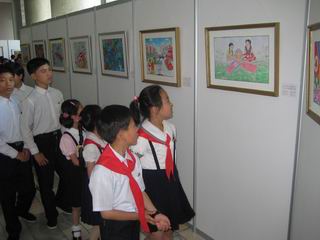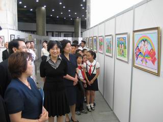 致辭結(jié)束后,出席開幕式的領(lǐng)導(dǎo)和學(xué)生們參觀了書畫展。萬景臺少年宮寬敞明亮的大廳頓時人頭攢動、熱鬧非常,一塊塊高大的展板前,身穿校服、圍系紅領(lǐng)巾的朝鮮少年兒童們興高采烈地觀看著一幅幅書畫作品。上海市對外文化交流協(xié)會代表團(tuán)團(tuán)長高嶺女士參觀書畫展后表示,朝鮮少年兒童的書法和繪畫水平高超,顯示出了扎實(shí)的藝術(shù)功底,且主題性強(qiáng),表達(dá)了他們對中朝友誼的祝福。朝鮮對外文化聯(lián)絡(luò)委員會副委員長田英進(jìn)也表示,中國少年兒童的想像力、創(chuàng)造力豐富,通過畫作表現(xiàn)出了積極向上的精神面貌和對未來的向往。