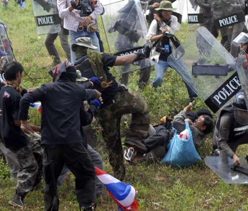 由于當(dāng)?shù)鼐用癫粷M黃衫軍在當(dāng)?shù)厥就,村民?dān)心會影響國家聲譽(yù)和柬埔寨的關(guān)系,因此村民在通往柏威夏寺的路上搭起路障,防暴警察也全副武裝,防止示威者通過。電視片段所見,黃衫軍多次揮動長棒,與防暴警察和試圖阻止他們進(jìn)入柏威夏寺一帶的村民發(fā)生沖突(見圖)。省政府官員表示有數(shù)十人在騷亂中受傷,其中二十人要送院治理,一名送院者頸部受到槍擊。事件最后在警方調(diào)解下解決。