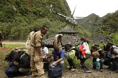 由于近日當?shù)乇┯赀B連,河水暴漲引發(fā)洪水,鐵路被阻斷,2000多名乘客被圍困在馬丘比丘,被迫滯留數(shù)日。秘魯當局派出直升機進行援救,目前為止疏散了1400名乘客,還將對仍然滯留800名乘客進行救助。