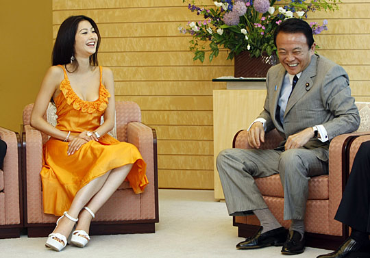 中新網(wǎng)5月15日電 日本首相麻生太郎15日上午在官邸接見(jiàn)了代表日本參加世界小姐選美大賽的宮坂繪美里。
