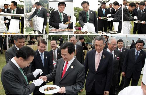 在蒙蒙細(xì)雨中東盟領(lǐng)導(dǎo)人手舉雨傘進(jìn)入了午宴會(huì)場(chǎng),而李明博戴著手套、身穿圍裙在炭爐前親自烤肉,吸引了各國(guó)領(lǐng)導(dǎo)人的目光。