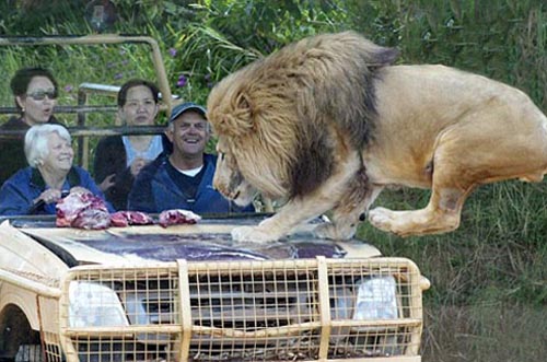 園方巧妙設(shè)置的吉普車,強化玻璃恰好就在擋風(fēng)玻璃處隔開籠內(nèi)與籠外,工作人員還在引擎蓋上放生肉吸引獅子跳上來,也讓游客能近距離觀賞。獅子大塊咬肉的模樣真夠嚇人,不少游客坐在車中都覺得自己彷佛就要成為猛獅的點心了。