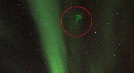 在一張他于1月21日拍攝的照片中,右上方有一個(gè)像綠色水母,又像降落傘的奇怪物體。米凱森描述說(shuō),“這個(gè)物體影像具有跟北極光相同的綠色。這意味著北極光是造成這個(gè)物體成影的光源。”