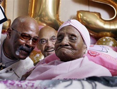 由于居住在葡萄牙的女人瑞在去年過(guò)世,貝恩斯由今年1月成為全球最老的人瑞,經(jīng)過(guò)吉尼斯世界紀(jì)錄委員會(huì)的認(rèn)證。她在美國(guó)大選中投下奧巴馬一票,成為最年長(zhǎng)黑人選民,見(jiàn)證歷史,全國(guó)知名。但她現(xiàn)在住在醫(yī)院里,平常還喝一點(diǎn)酒。