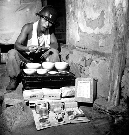 1951年7月17日,一名韓國軍人在因戰(zhàn)火而遭破壞的京畿道坡州市汶山里一座房子里正在吃午飯。放在前面的是日本產(chǎn)軍用食品,可能是為了和韓國的日常就餐相比較,拍攝者有意擺在前面。