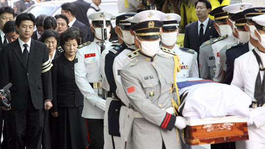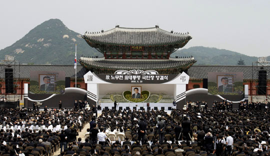 上午11時(北京時間10時),靈車行列抵達(dá)景福宮興禮門前院時,軍樂隊演奏《永遠(yuǎn)的安眠》,盧武鉉遺體告別儀式正式開始。