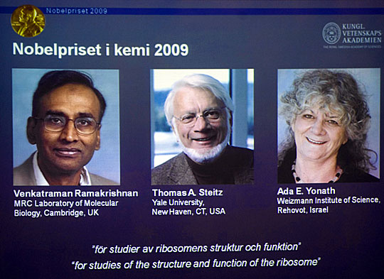 拉馬克里希南1952年出生于印度,目前持美國(guó)國(guó)籍,任職于英國(guó)劍橋MRC分子生物學(xué)實(shí)驗(yàn)室;施泰茨1940年出生于美國(guó)威斯康星州,任職于美國(guó)耶魯大學(xué)和霍華休斯醫(yī)學(xué)研究所;約納特1939年出生于耶路撒冷,任職于以色列魏茨曼科學(xué)研究所。3人將平分諾貝爾化學(xué)獎(jiǎng)獎(jiǎng)金1000萬(wàn)瑞典克朗。