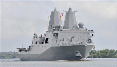 這艘軍艦是美國(guó)圣安東尼奧級(jí)船塢登陸艦的第六艘,全長(zhǎng)二百零八米,船員二百九十名。來(lái)自世貿(mào)中心的鋼材于被用于制造“紐約號(hào)”上的兩棲登陸平臺(tái),“它可以讓一支七百人的海軍陸戰(zhàn)隊(duì)在任何地方登陸”,美國(guó)海軍少校柯蒂斯·瓊斯說(shuō)。目前“紐約號(hào)”的主要任務(wù),正是將美國(guó)海軍部署到反恐行動(dòng)現(xiàn)場(chǎng)。