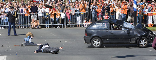 荷蘭中部城市阿珀?duì)柖鄠?月30日舉行“女王日”慶;顒,荷蘭全國各地每年的這一天都會舉辦各種慶;顒印5驮诤商m女王貝婭特麗克絲率王室成員乘坐敞蓬大客車參加活動時(shí),一輛黑色鈴木小汽車突然從側(cè)面沖進(jìn)舉行游行的街道,導(dǎo)致現(xiàn)場多人被撞死和撞傷,剛剛駛過現(xiàn)場的荷蘭王室成員乘坐的客車沒有受到碰撞。事故發(fā)生后,荷蘭王宮宣布取消女王當(dāng)天所有的活動行程,貝婭特麗克絲女王對此事深表震驚,并向死傷者家人表示慰問。荷蘭多個城市也相繼取消了當(dāng)天“女王日”的慶;顒。當(dāng)天有目擊者稱,在轎車失控沖向人群時(shí),司機(jī)趴在方向盤上一動不動,似乎已經(jīng)神志不清。