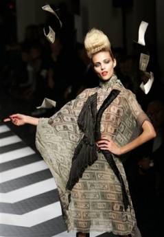 中新網(wǎng)3月10日電 據(jù)路透社報(bào)道,日前在法國知名時(shí)裝設(shè)計(jì)師高堤耶(Jean-Paul Gaultier)的服裝秀上,模特們身著用大把鈔票模樣堆砌而成的黑色禮服,而設(shè)計(jì)師克里斯汀-拉克魯瓦(Christian Lacroix)則設(shè)計(jì)出了巴洛克風(fēng)格的黃金禮服和大毛皮領(lǐng)。巴黎時(shí)裝展就是敢于走頹廢路線。