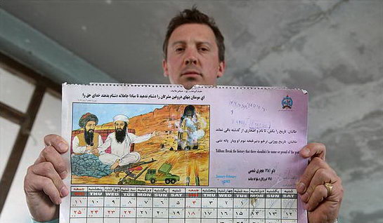 據(jù)悉,英軍士兵在塔利班據(jù)點(diǎn)內(nèi)一面墻上發(fā)現(xiàn)這本月歷。與普通的美女、跑車(chē)或者風(fēng)景月歷不同,塔利班月歷一月份封面人物是基地組織頭目拉登和塔利班最高頭目奧馬爾,他們身邊放著錢(qián)和武器,手指著被塔利班炸毀的巴米揚(yáng)大佛。二月份月歷封面是一個(gè)塔利班墳場(chǎng)。這本月歷上不僅有普什圖語(yǔ),而且還有阿拉伯語(yǔ)、波斯語(yǔ)和英語(yǔ)。