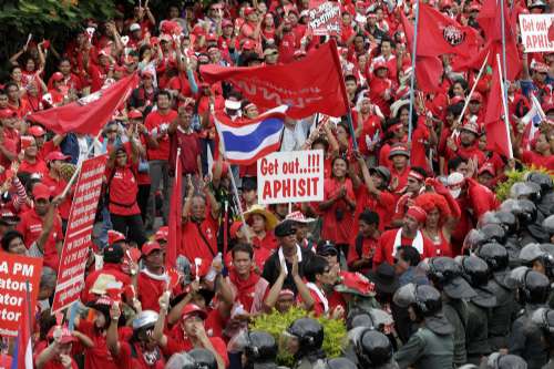 十日早上,數(shù)千名身著紅衫的泰國反獨裁民主聯(lián)盟(反獨聯(lián))示威者陸續(xù)在帕塔亞市中心聚集,示威者高呼反對總理阿披實的口號,誓言阿披實一日不下臺,一日不會離開。示威領(lǐng)袖強調(diào),阿披實政府無權(quán)舉行今次東盟峰會,因為他的政權(quán)不合法,只是軍隊的傀儡,不能代表泰國;而示威者并非針對峰會本身,不過如有必要,則會阻止峰會舉行。