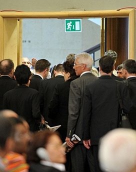 當(dāng)他說到以色列借助二次大戰(zhàn)“猶太人的痛苦”成立國(guó)家時(shí),包括英國(guó)及法國(guó) 大使在內(nèi)的幾名歐洲代表實(shí)時(shí)離場(chǎng),以示抗議。法國(guó)總統(tǒng)薩科齊指摘內(nèi)賈德散播“仇恨言論”,要求歐盟各國(guó)采取強(qiáng)硬立場(chǎng)。聯(lián)合國(guó)人權(quán)專員的發(fā)言人亦批評(píng)內(nèi)賈德言論“不恰當(dāng)”。會(huì)議期間也至少有3名小丑打扮、戴著七彩假發(fā)及紅鼻子的法國(guó)猶太學(xué)生組織示威者,在會(huì)場(chǎng)上抗議內(nèi)賈德,打斷其講話。
