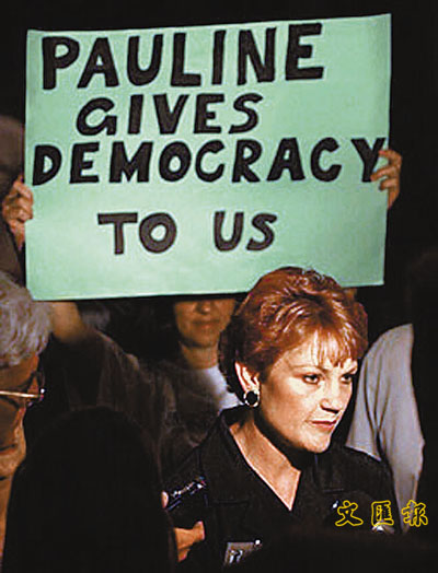 漢森于1996年獲選為國(guó)會(huì)議員,從政首場(chǎng)演講中便警告澳洲可能被亞洲人“淹沒(méi)”。她帶種族歧視的偏見(jiàn)激起國(guó)際不滿。