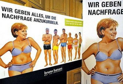 據(jù)法新社報道,德國一家內(nèi)衣公司5月1日在柏林著名商業(yè)街庫達(dá)姆街推出了一個1000平方英尺的巨幅電子廣告牌,廣告牌上是德國政治家著內(nèi)衣的形象,其中包括德國總理默克爾,她身穿一套紫色胸罩和運動短褲。廣告牌上的文字寫著:“我們盡全力增加需求!