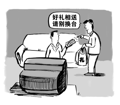 我選了“收買”條件最好的一家衛(wèi)視臺節(jié)目,每天一開電視,就鎖定這家頻道,堅持了起碼大半年。本來,家里最喜歡看本地電視臺,可人家電視臺禮金高,收了人家的錢,拿了人家的禮,我也要負(fù)責(zé)任的。再說了,現(xiàn)在電視臺節(jié)目也差不多,一個電視劇幾家同時播,看哪臺不都差不多?而且,人家的節(jié)目也不錯。