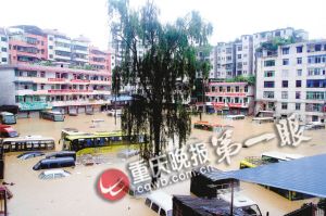 前晚9時(shí)許,酉陽(yáng)縣城開始下起暴雨。昨晨,酉城河水也漫過(guò)河床,涌向縣城主街的低洼角落。至上午10時(shí)許,縣城東風(fēng)壩、城北車站、小商品一條街、桃花源中路等街道門面進(jìn)水,水深1.5米左右,酉陽(yáng)報(bào)社被淹,停放在街邊、車站內(nèi)的許多車輛被水淹沒。