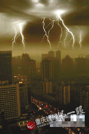 昨上午10時(shí)左右,大片的黑色云朵從北向南逼近并覆蓋主城上空,原本已放亮的天空,慢慢地變黑,短短10多分鐘,整個(gè)主城區(qū)已經(jīng)宛如黑夜,馬路上的車輛紛紛打開車燈,緩慢行駛!疤旌凇睕]多久,閃電劃破“夜空”,驚雷緊隨而至,并未經(jīng)過(guò)鋪墊,大雨如注鋪天蓋地砸向地面,突如其來(lái)的暴雨,致使主城很多地方的道路產(chǎn)生積水。
