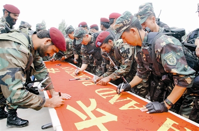 今天(9日)9時20分,“友誼—2010”中巴反恐聯(lián)合訓練上演“壓軸戲”,200余名中巴特種兵在蘭州軍區(qū)某訓練基地舉行實兵實彈綜合演練。隨后,此次中巴反恐聯(lián)合訓練落下帷幕。