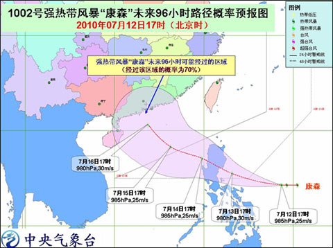 中央氣象臺消息,今年第2號熱帶風(fēng)暴“康森”(CONSON)已于7月12日下午加強為強熱帶風(fēng)暴,下午5時其中心位于菲律賓馬尼拉以東大約830公里的西北太平洋洋面上,就是北緯14.3 度,東經(jīng)128.7度,中心附近最大風(fēng)力有10級(25米/秒),中心附近最低氣壓985百帕。