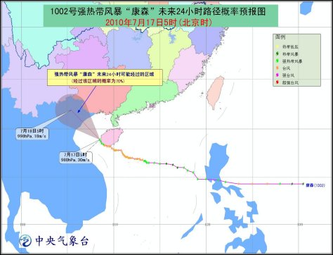 受其影響,17日白天到夜間,南海西北部、瓊州海峽、海南省及其沿海、廣東西部沿海、廣西沿海、北部灣將有7~9級(jí)大風(fēng),“康森”中心經(jīng)過(guò)的附近海面的風(fēng)力可達(dá)10~12級(jí),北部灣部分海域陣風(fēng)可達(dá)13~14級(jí);廣東西南部、廣西南部、海南、云南東南部將有大到暴雨,其中海南西部、廣西南部的部分地區(qū)有大暴雨。