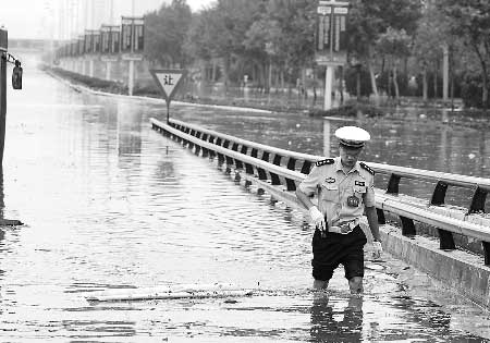 在金水路京廣鐵路立交橋下,記者看到,積水已完全淹沒地下通道,人行道和慢車道都是水,記者拿根木條試了試,水深大概1.5米。執(zhí)勤交警稱,從7時至8時30分,因積水太深,該路段交通雙向斷行1個半小時,直至13時,金水路金橋賓館附近交通才恢復(fù)正常。
